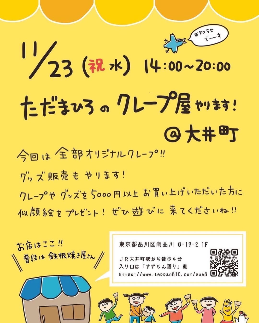 当日はただまひろさん監修の絶品オリジナルクレープ(限定100食)や素敵なグッズの販売、またご希望のお客様には「似顔絵」の作製(!)を行います😊